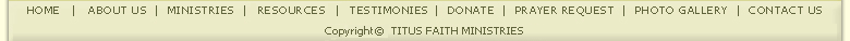 Titus Faith Ministries was started in 1997. For the past 20 years the lord has blessed our ministries. By the grace of god we are growing and enlarging our coast. Please convey your comments and support as the lord leads. We solicit your firm prayer support. |
